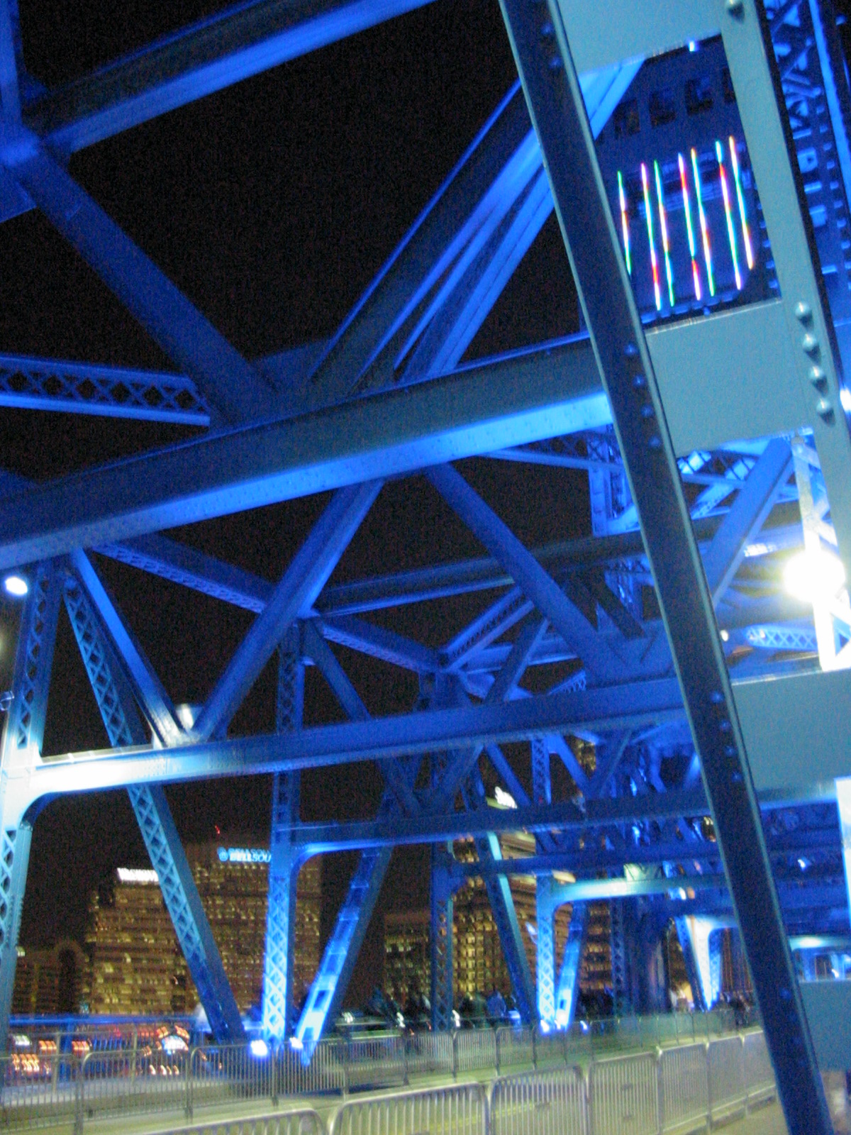 The Main Street Bridge, properly known as the John T. Alsop Jr. Bridge, was closed to vehicles at night during Super Bowl week in Downtown Jacksonville. Note the barricades in the driving lanes: this was bicycle territory.